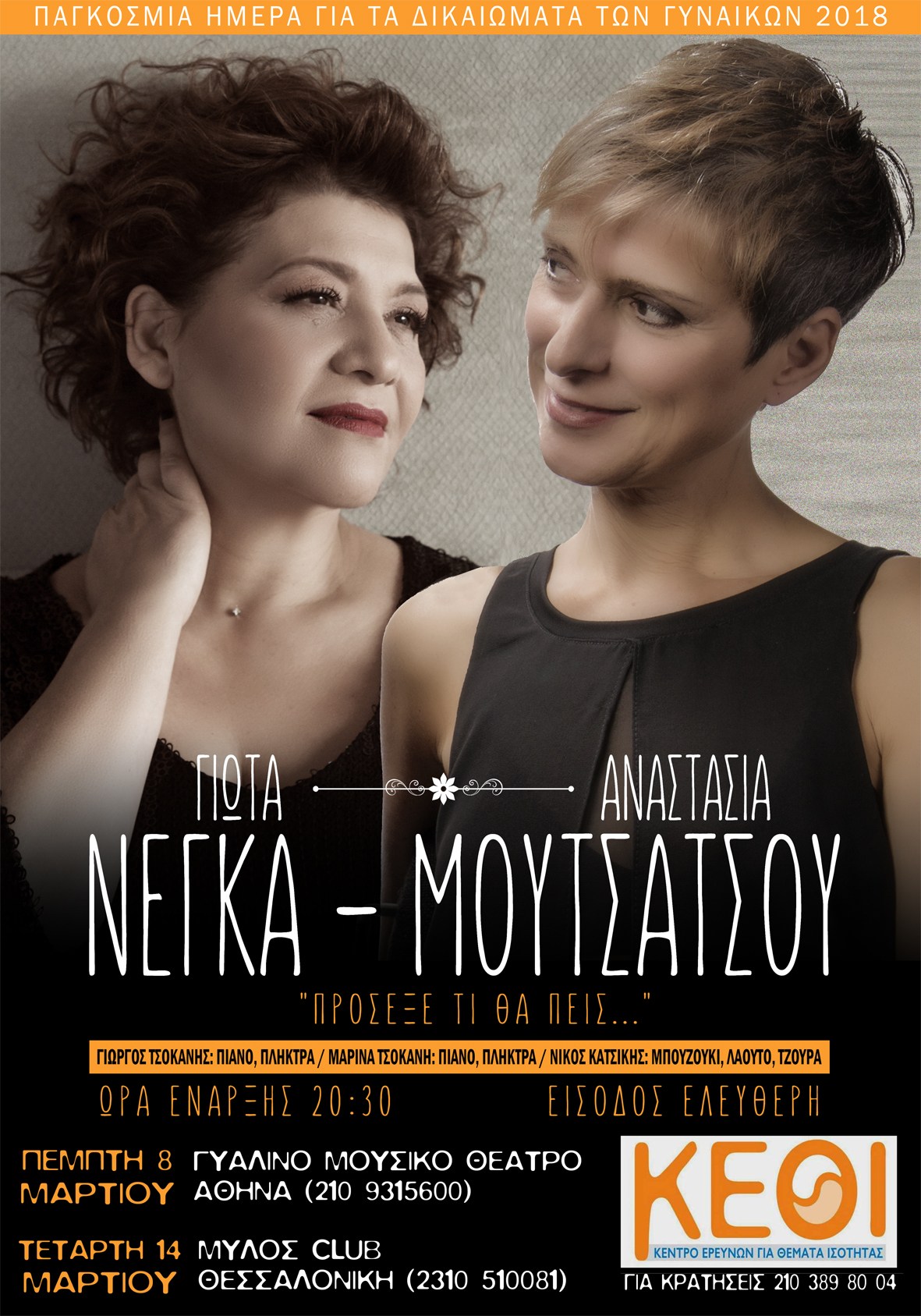Μια μουσική παράσταση που διοργανώνει την το Κέντρο Ερευνών για Θέματα Ισότητας (Κ.Ε.Θ.Ι.) αφιερωμένη στην Παγκόσμια Ημέρα για τα Δικαιώματα των Γυναικών 2018. Την μουσική παράσταση θα μας παρουσιάσουν οι δύο καλλιτέχνιδες (αν καταφέρουν να συμφωνήσουν στο τι θα πουν…), η Αναστασία Μουτσάτσου και η Γιώτα Νέγκα, στο Γυάλινο Μουσικό θέατρο την Πέμπτη στις 8 του Μάρτη και ώρα 21:00 (ώρα προσέλευσης 8.30μμ) και την Τετάρτη 14 Μάρτη στο Mylos- club στη Θεσσαλονίκηκαι ώρα 21:00 (ώρα προσέλευσης 8.30μμ).